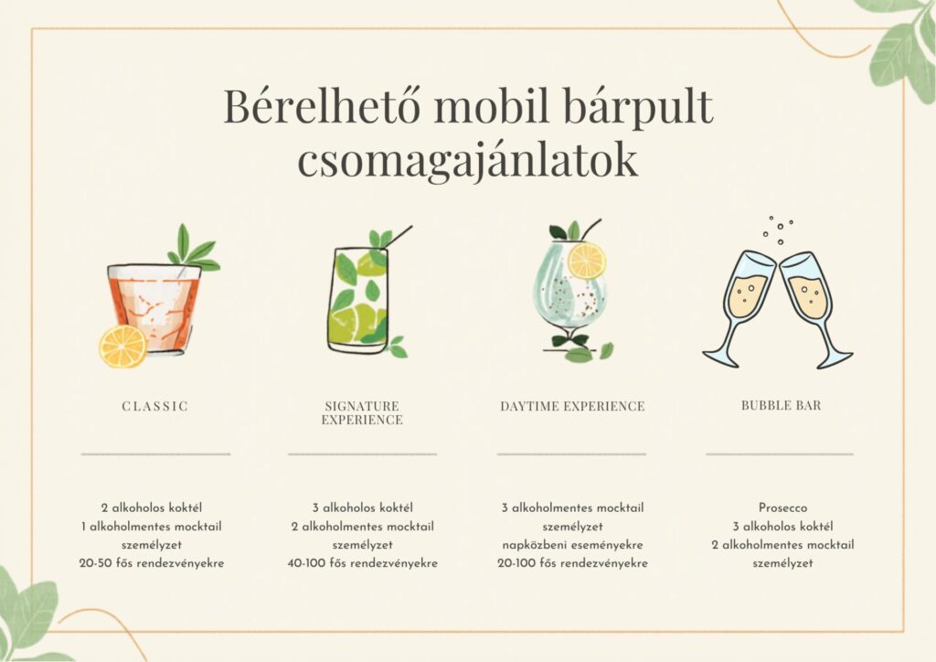 ✔ Alkoholmentes italok: Látványos és ízletes frissítő koktélok, alkoholmentes pezsgő, vagy egészséges gyümölcslevek és juce-ok, ideálisak napközbeni rendezvényekre vagy az alkoholt nem fogyasztó vendégek számára.